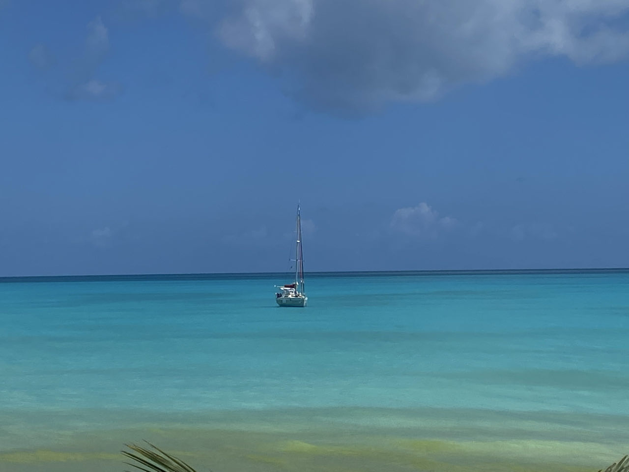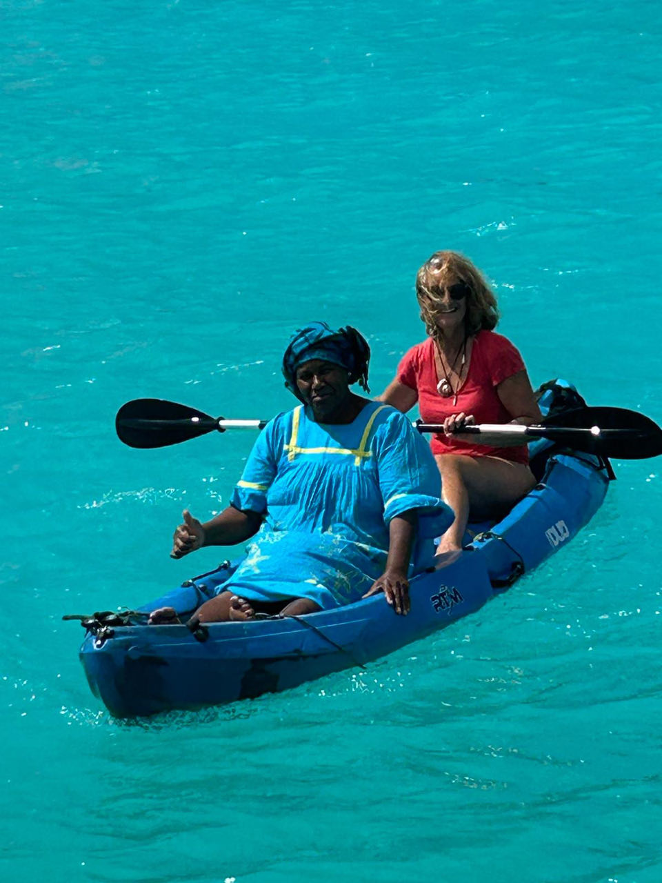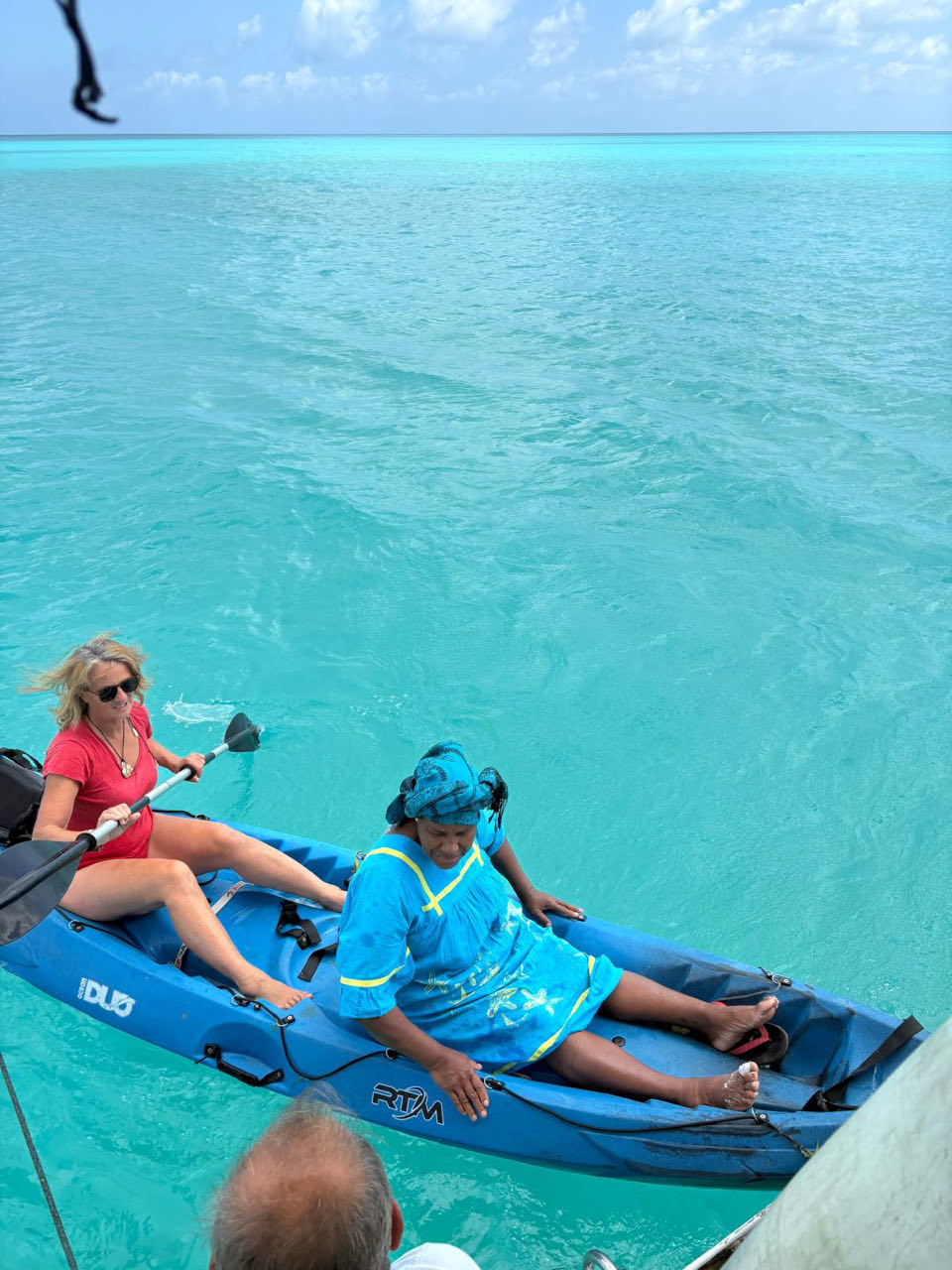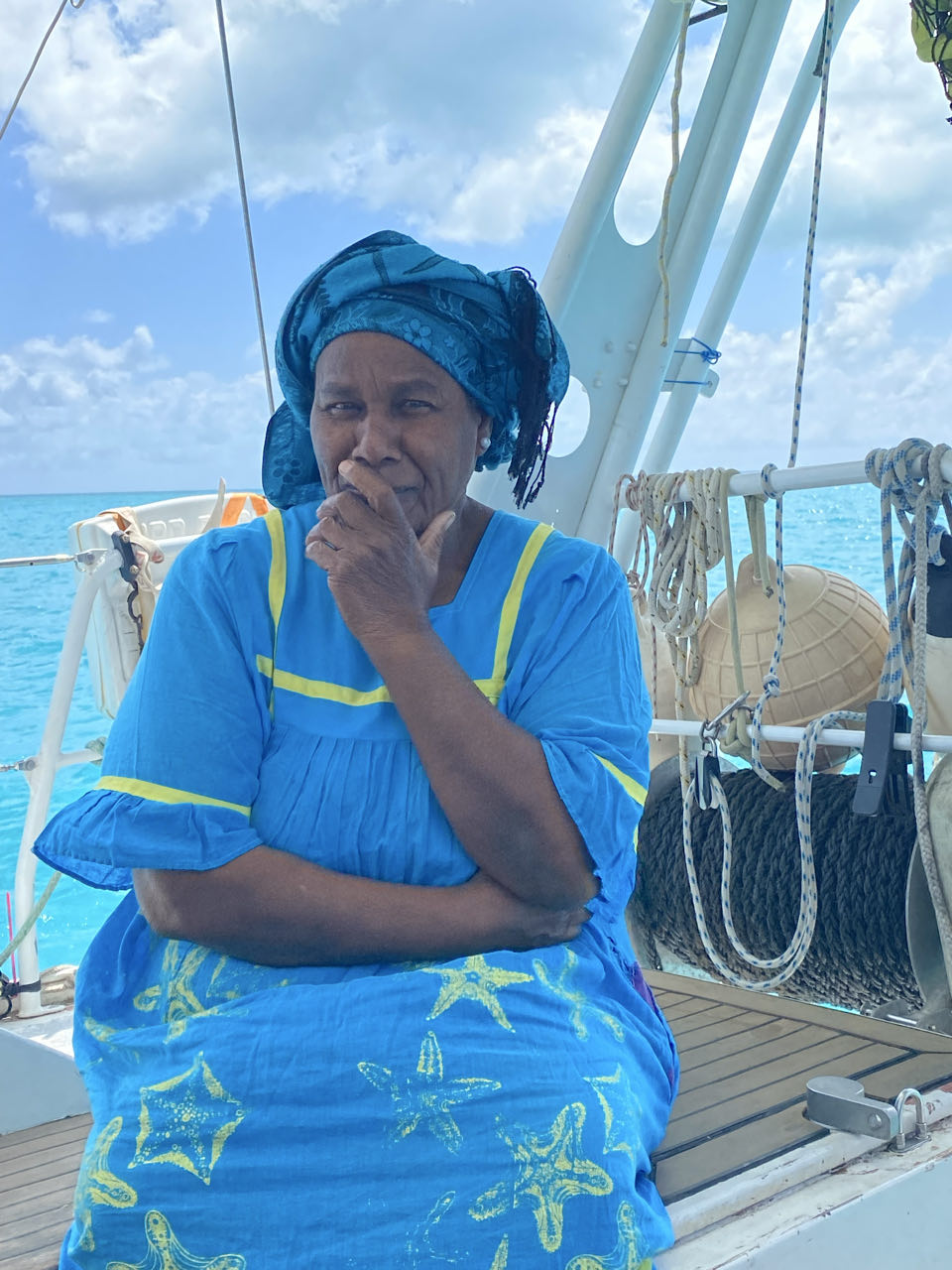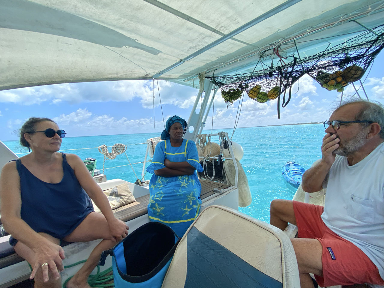 Il faut d abord rejoindre le bord… en canoé… ça bouge mais elle est stoïque. Transfert à bord sans problème malgré une petite appréhension face aux vagues et mouvements du bateau. Elle est ravie, reconnaissante de ce qu’elle reçoit comme un cadeau d’anniversaire. Elle profite en écoutant de la musique : Cesaria Evora au rythme d’une navigation calme sous génois…