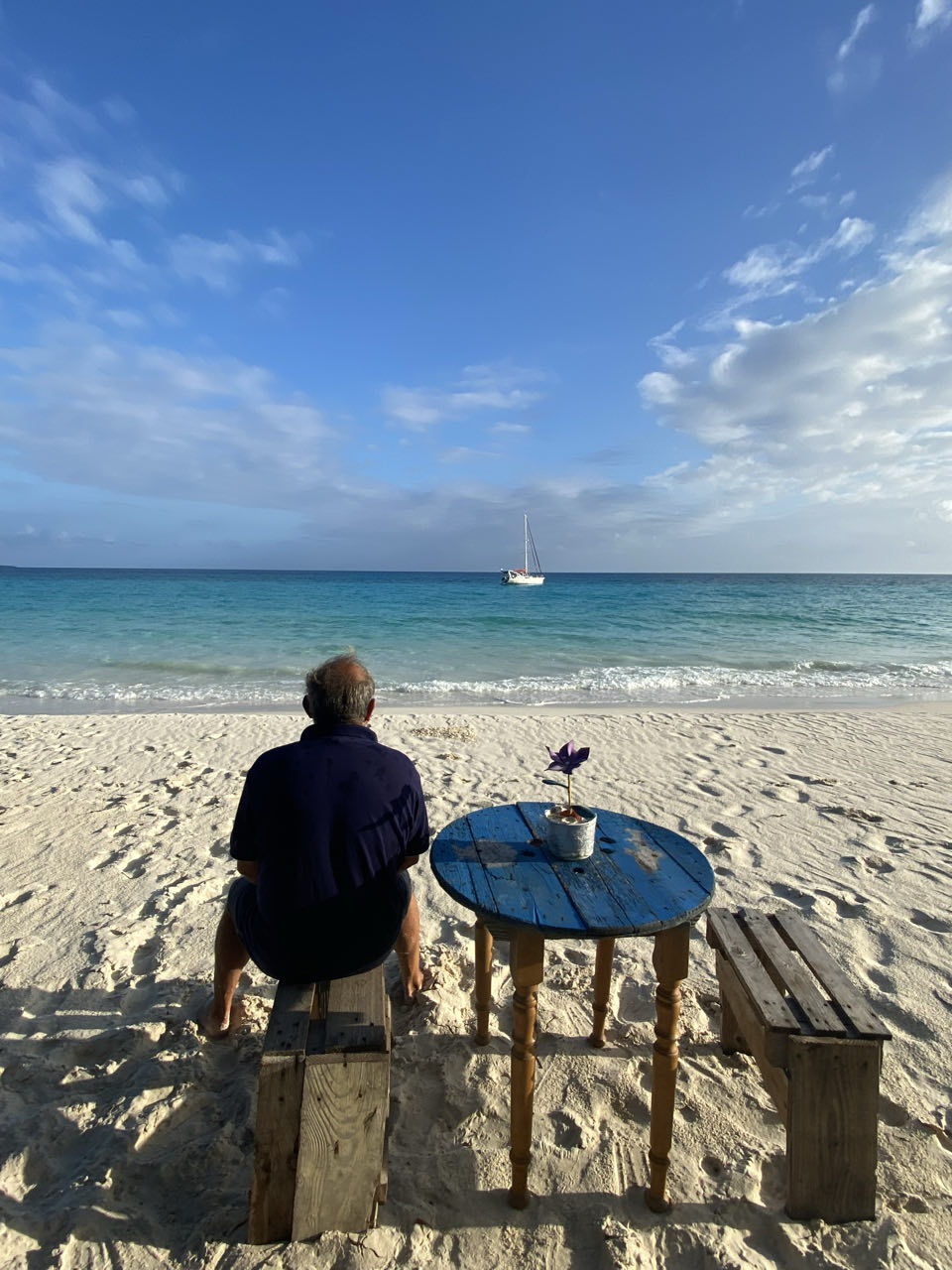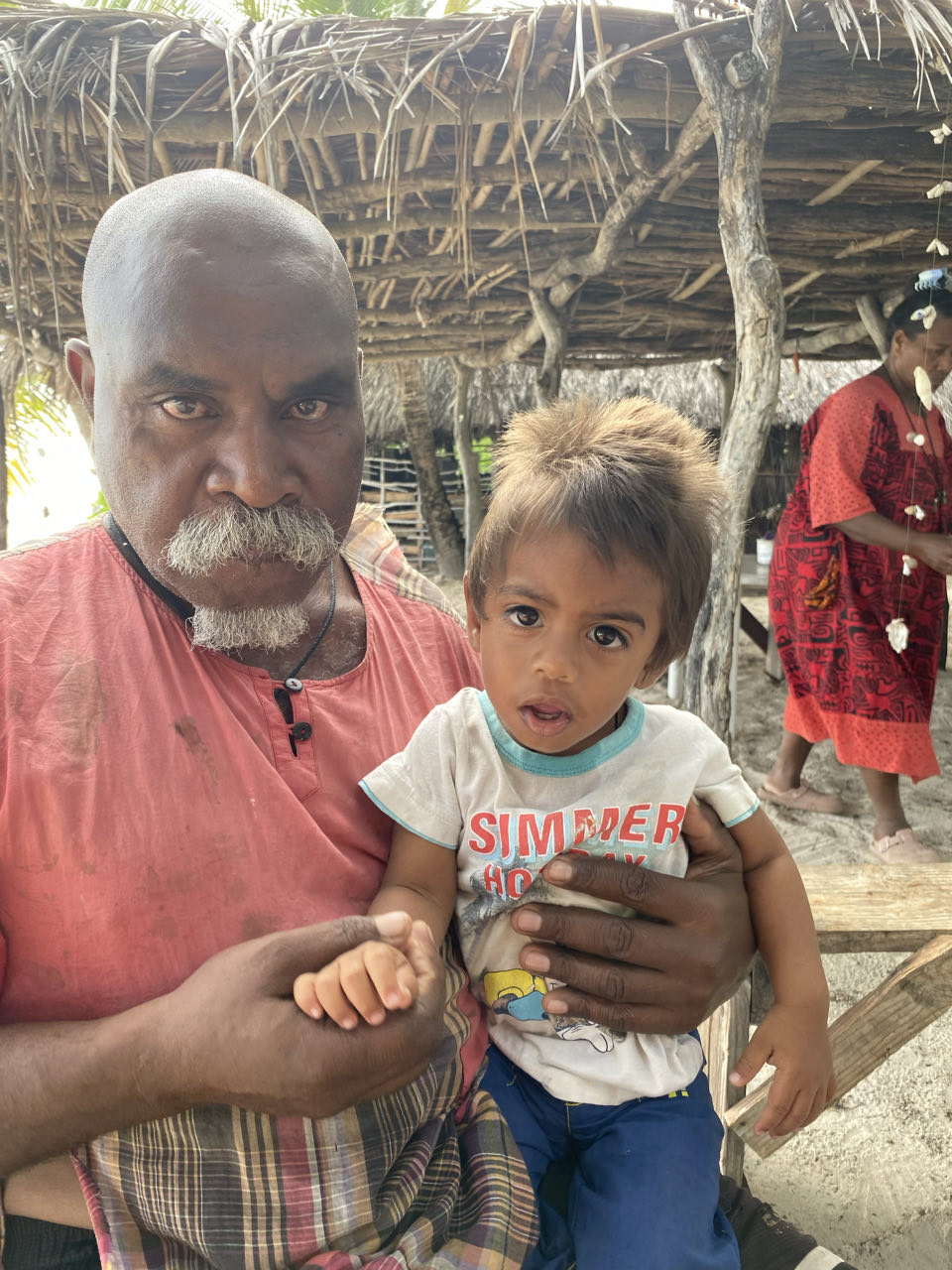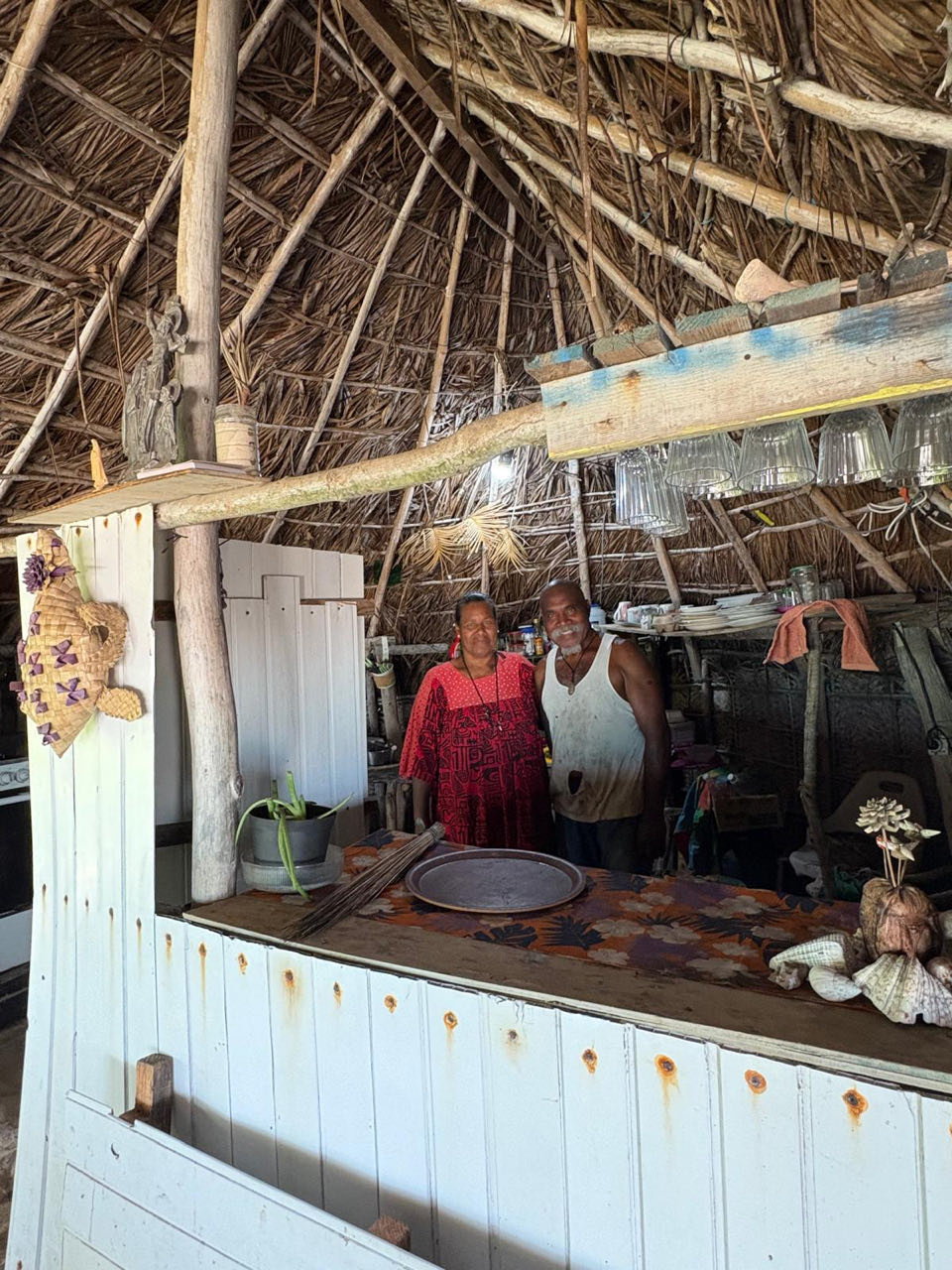 Elle et Privât ont une petite table d’hôte sur la plage à Mouli : One Sina (qui signifie Sable Blanc). Comme Marie Aimée est avec nous elle demande à Privât de préparer le repas : un crabe de cocotier et du poisson de lagon, tous pêchés par les fils, de l’igname et du tarot en beignet, une salade de papaye verte de leur jardin et l’eau de pluie. Simplicité, authenticité, délice d’un repas convivial avec leurs produits au bord de la plage, une petite table faite main dressée pour nous.