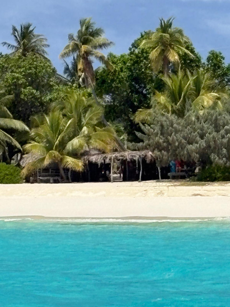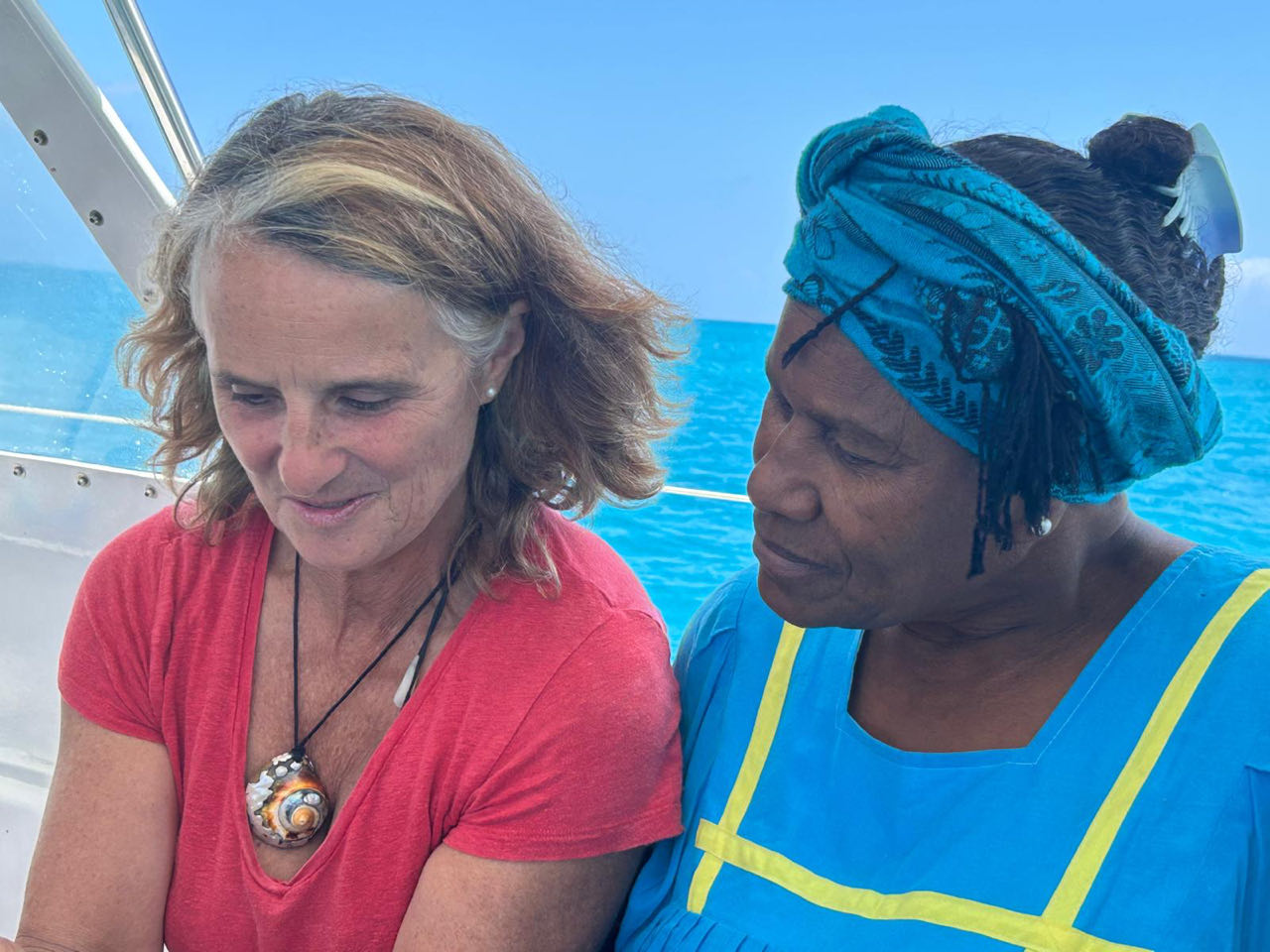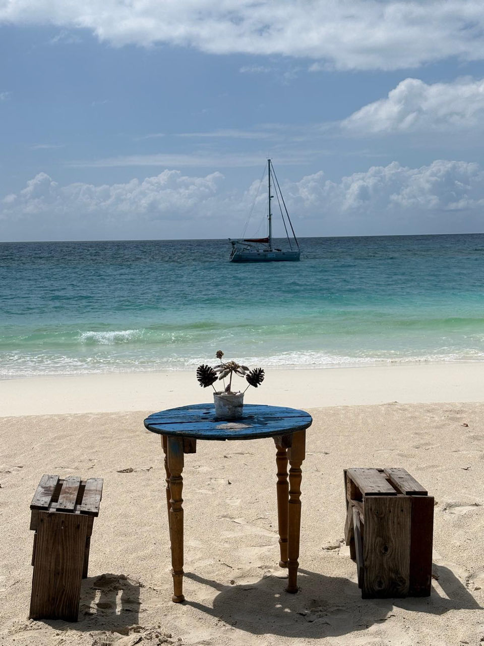 Elle et Privât ont une petite table d’hôte sur la plage à Mouli : One Sina (qui signifie Sable Blanc). Comme Marie Aimée est avec nous elle demande à Privât de préparer le repas : un crabe de cocotier et du poisson de lagon, tous pêchés par les fils, de l’igname et du tarot en beignet, une salade de papaye verte de leur jardin et l’eau de pluie. Simplicité, authenticité, délice d’un repas convivial avec leurs produits au bord de la plage, une petite table faite main dressée pour nous.