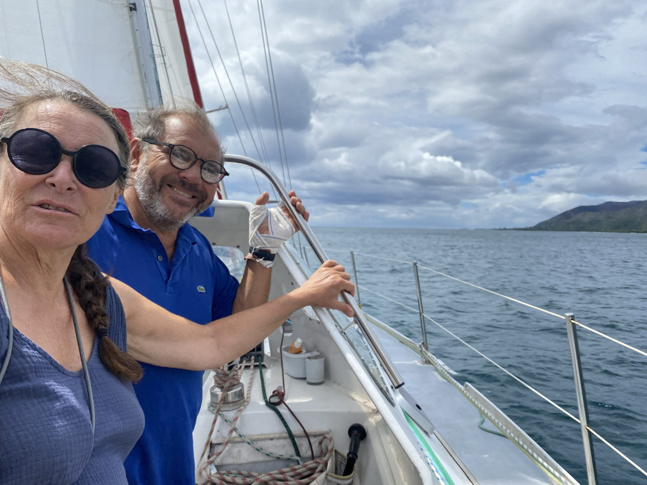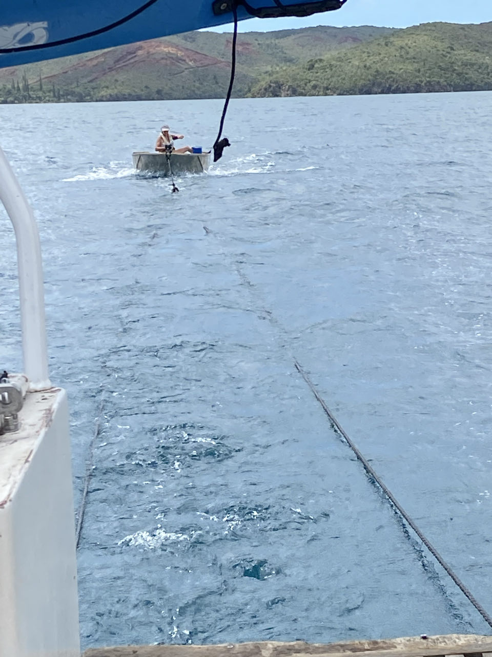 Je décide de la remorquer à Nouméa vers un soudeur qui la remettra en état. Mais mon dispositif d’étanchéité est percé, nous la remettons à l’eau avec Fred : elle prends sérieusement l’eau… Fred propose d embarquer pour écoper pendant qu’on avancera à une vitesse suffisante pour éviter trop de remplissage… et c’est ce que nous faisons: six heures durant!