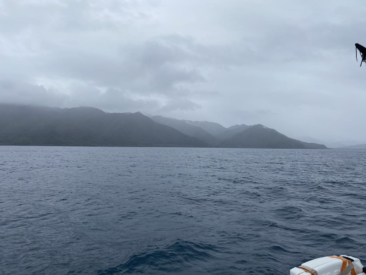 Un crachin breton, nuances de gris sur gris, du coup nous écoutons de la musique Irlandaise en imaginant des falaises que nous ne distinguons pas dans ce brouillard… pas très vendeur pour « la prestation ». Nous entrons dans la baie de Kouacoué bien à l’abri. Et là, (est ce la fatigue? L’oubli de ka consigne sans cesse répétée « deux pieds une main pour le bateau, une pour ce qu’on a à faire »?), alors que nous allions affaler la grand voile Fred bascule en arrière, culbutant par dessus la filière … à l’eau! Je n’en crois pas mes yeux mais lance d’emblée un « Femme à la mer » qui réveille Dom.