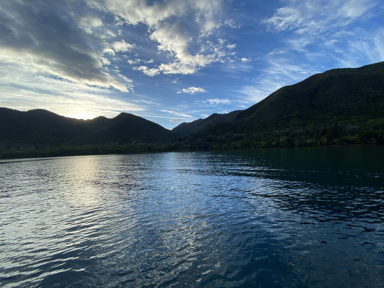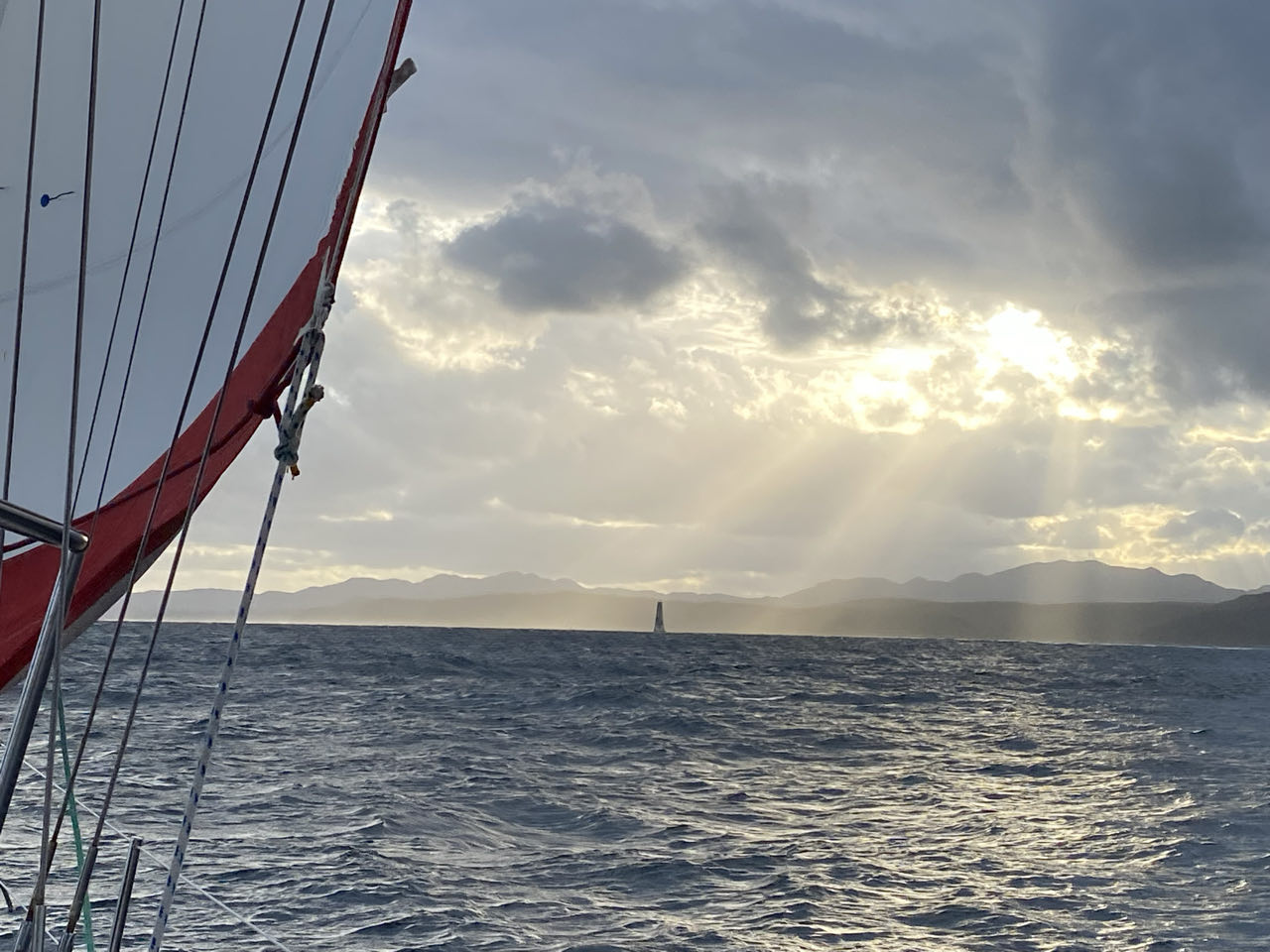 Le lendemain, nous longeons la côte , aux nuances d’ocre, terre de sienne, rouge, dégradés de verts… et le coucher de soleil au passage du canal de Havannah, au près avec appui moteur contre vents et courants… pour arriver dans la nuit à l’anse Magic de la baie de Prony… où « Bernadette » nous attend encore!