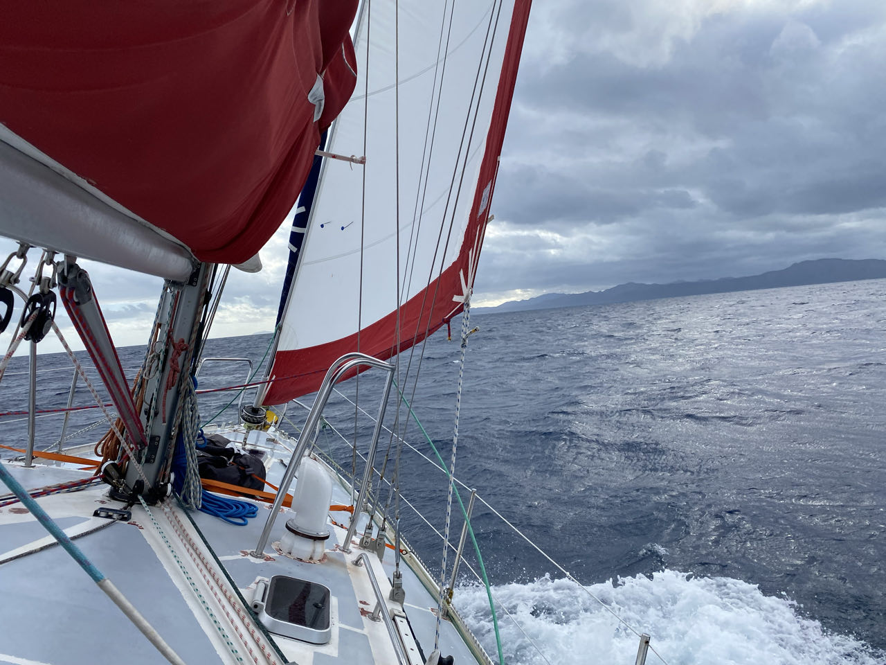 La manœuvre de récupération est simple : je donne à Dom l’ordre de ne pas la quitter des yeux, affale la GV, lance un pare battage, fait route au moteur vers elle et elle remonte à bord sans problème et en rigole. Moi, j’avoue je n’ai pas trouvé cela très drôle… C’est la première fois que cela arrive à bord et comme c’est la hantise de tout skipper, cela m’a marquée … j’en ai rêvé la nuit suivante avec un scénario plus grave, Fred inconsciente qui coule … preuve qu’on n’est jamais à l’abri d’accident et qu’il faut toujours anticiper et être prudents pour l’éviter au maximum! Ah la dure vie du skipper!